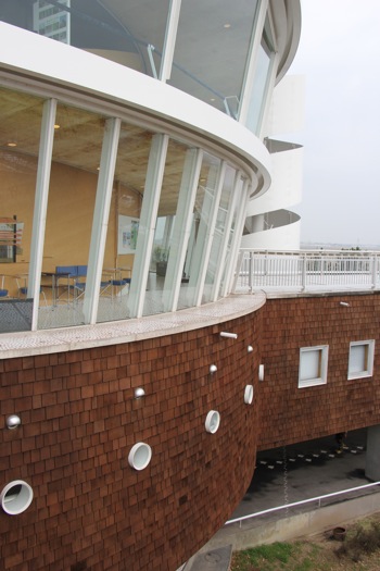 そんな土地に立てられた展望塔が、とても気に入りました。細かいところまで配慮されたデザインで、特に真っ白の、巻貝の中心みたいな螺旋の外階段がすごく気に入った!車道をまたぐ歩道橋にも同じ螺旋階段があって、併設されたエレベーターは表面を木肌で飾るというこだわり。この木肌の装飾が、なんだか北欧とか、ムーミンの世界を思わせてすごく温かかった。建物内の一番外側(窓ガラス側)は景色を見るためにぐるりと展望スペースになっているんだけど、そのひとつ内側に緩やかな螺旋状の階段がある。これも、巻貝とまさに同じアイデアで、真っ白な螺旋階段は、オランダのデザイン美術館のよう。福島潟に来て、名建築を見られるとはラッキーでした。青木淳さんという建築家の手によるもので、ちょっと調べたら青森県立美術館などを手がけている大活躍の建築家さんでした。さっそくサイトに行ってみて、沢山の作品を見せてもらったら、ルイヴィトンなど…、最近はすごく近代的なデザインが多いようで、 福島潟の展望塔が一番良いではないか!もうひとつの「遊水館」には今回行かなかったので、次回は菜の花の季節に再び訪れてみたい。