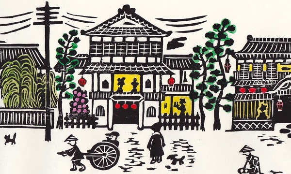 遊郭通り Wood Cut Print木版手彩色 33cm×14cm 昔の資料を元に、私なりに遊郭通りを描いてみました。時代は恐らく、江戸末期くらい、明治の文明開化が来ていない和風建築の通りです。実際はどうだったか分からないけど、通りを歩く物売り、お使いに出かける女性、遊郭に入ろうとしている常連の旦那を想像しながら描きました。